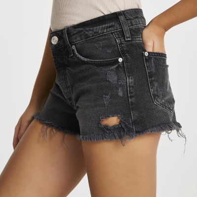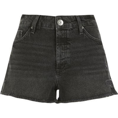 Black mid rise distressed denim shorts